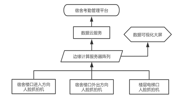 基于本校宿舍基本情況,結(jié)合學(xué)校運(yùn)營(yíng)管理模式,將宿舍考勤系統(tǒng)軟硬件模塊按照如下架構(gòu)圖部署。綜合樓大門處出入兩方向根據(jù)樓道寬度分別安裝2-4個(gè)人臉識(shí)別抓拍機(jī),6-11樓層電梯口各安裝2-3個(gè)人臉識(shí)別抓拍機(jī),抓拍機(jī)視頻圖像數(shù)據(jù)通過網(wǎng)絡(luò)路由設(shè)備實(shí)時(shí)匯總*宿管邊緣計(jì)算服務(wù)器陣列,服務(wù)器將視頻流信息中解析出的人臉數(shù)據(jù)與校方學(xué)生人臉庫(kù)信息進(jìn)行實(shí)時(shí)N比N快速驗(yàn)證,獲得學(xué)生身份信息,將對(duì)比結(jié)果實(shí)時(shí)顯示在數(shù)據(jù)可視化大屏上。結(jié)合學(xué)校考勤及宿舍管理邏輯,將各維度報(bào)表分析推送*云服務(wù)器,校方管理人員可通過宿舍考勤管理平臺(tái)獲取數(shù)據(jù)分析結(jié)果。